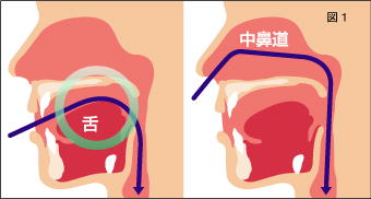 カメラが舌の根元(舌根)に触れることで、咽頭反射(嘔吐感”おえっ”とした感じ)が起こります。 鼻からの挿入でこの問題が解消しました。(図1)